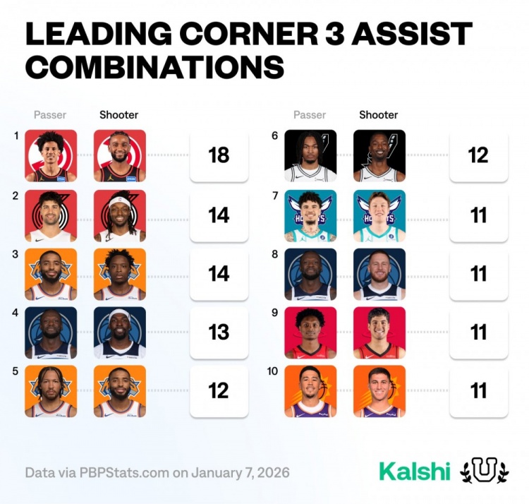 本赛季底角三分传射组合榜:杰伦约+沃克高居第1 阿门+谢泼德上榜