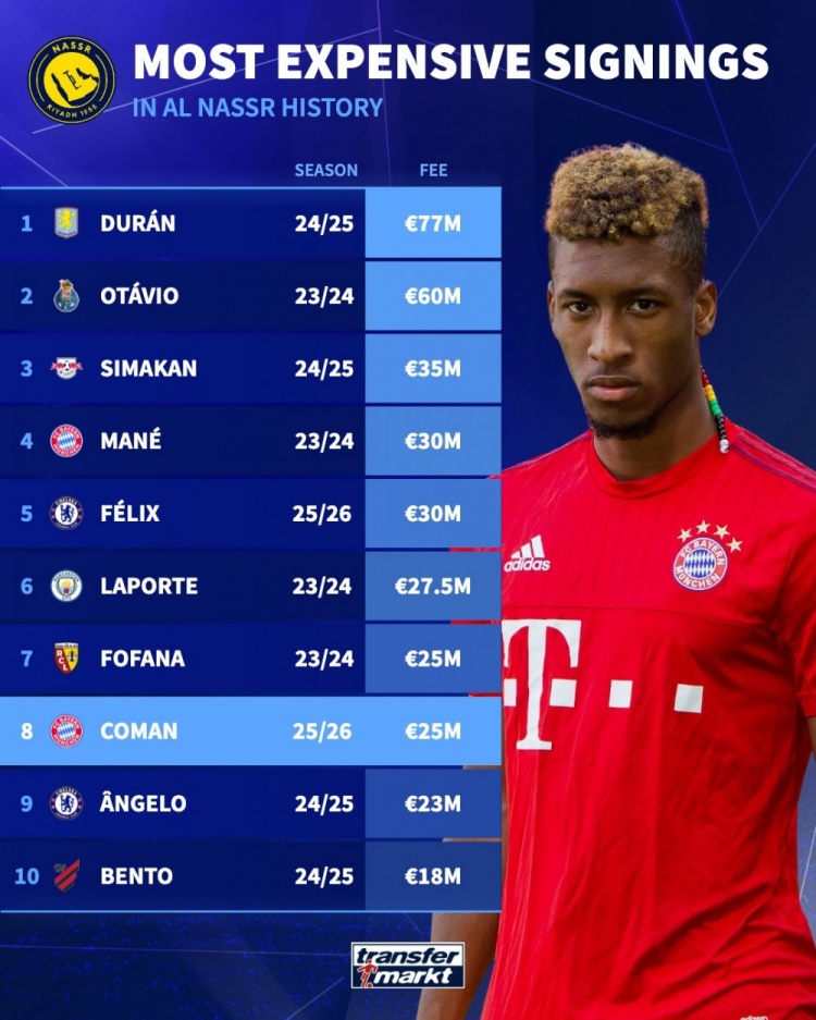 8月16日讯 利雅得胜利官方宣布签下拜仁边锋科曼,德国转会市场列出了利雅得胜利队史最贵引援排名,杜兰7700万欧居首,科曼2500万欧排在并列第7位。